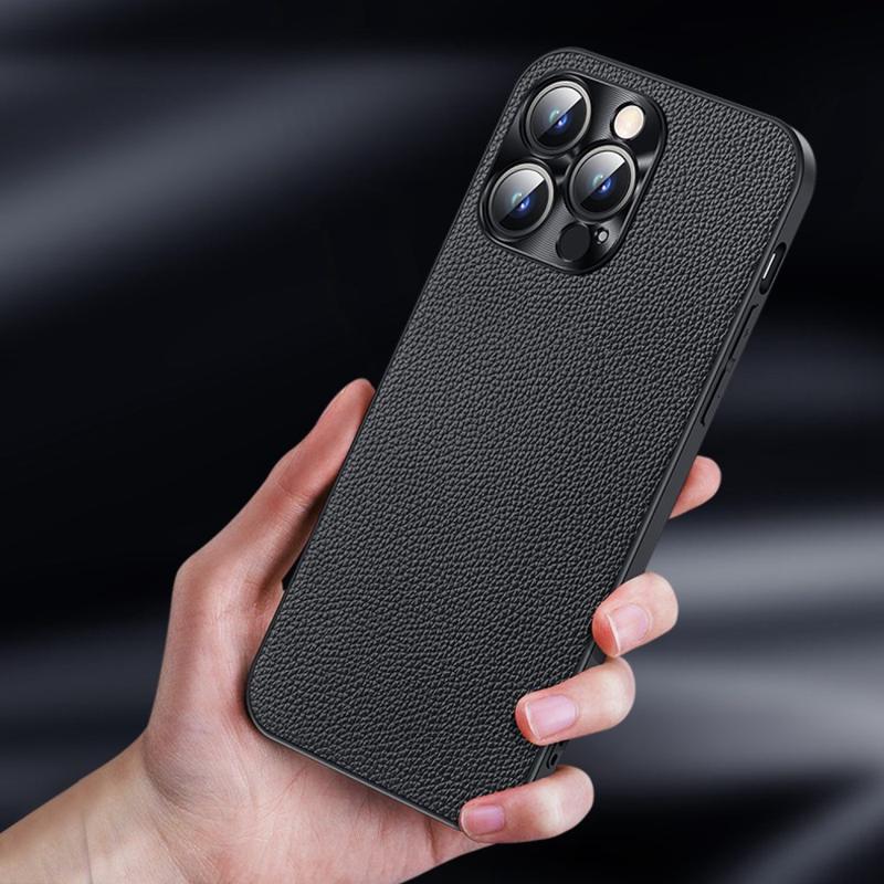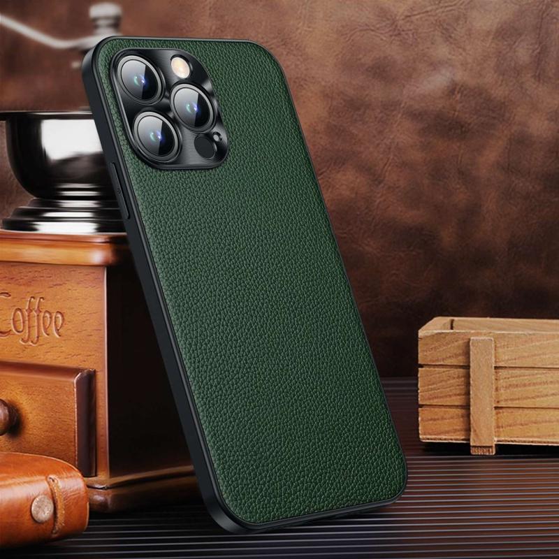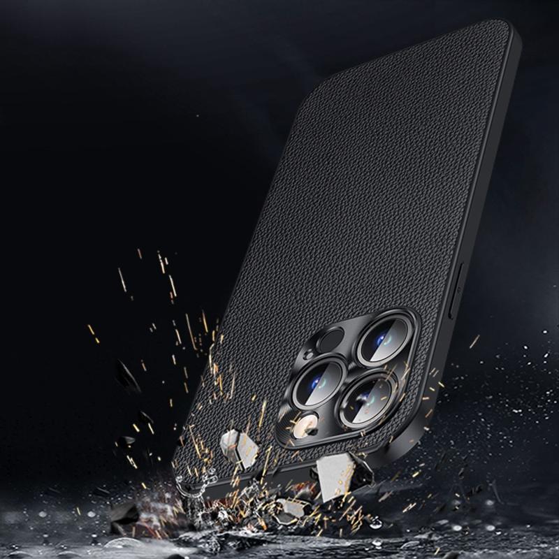 • Cowhide Leather + TPU Phone Case for iPhone 14 Pro Anti-Fall Protective Case Litchi Texture Shockproof Cover with Metal Camera Frame Made from Genuine Cowhide Leather+TPU material, with a metal camera lens frame, safer The surface of the phone case is designed with the Litchi texture looks fashionable and special  TPU combined with genuine leather coated to protect your phone from daily damage and scratch The protective case looks really nice and super easy to install/remove, keeping your phone in a simple design Precise cutouts for the camera, speaker, earpiece, and other ports allow easy access to all functions