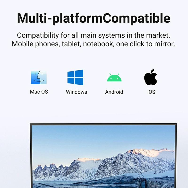 Der P1000 ist mit Android, iOS, Windows und macOS kompatibel und unterstützt Miracast- und P2P-Technologien. Dies ermöglicht eine nahtlose Spiegelung des Bildschirms über mehrere Geräte hinweg und eignet sich daher sowohl für den privaten als auch für den professionellen Einsatz.