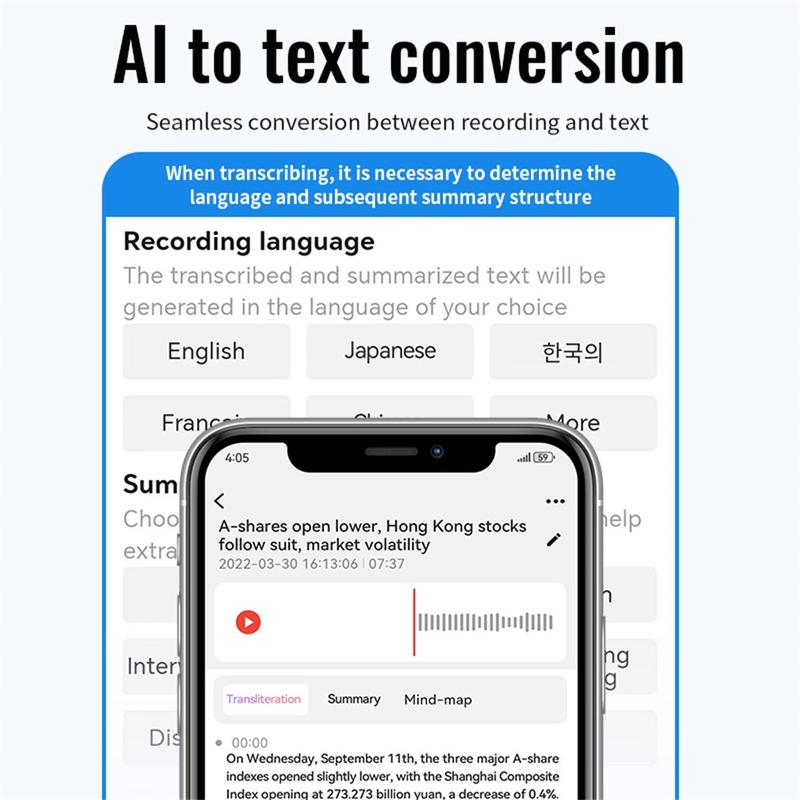 - KI-gestützte Transkription und Übersetzung: Verbindet sich über Bluetooth mit der AIREC-APP für Echtzeit-Transkription und Übersetzung in 59 Sprachen.
