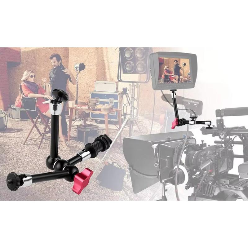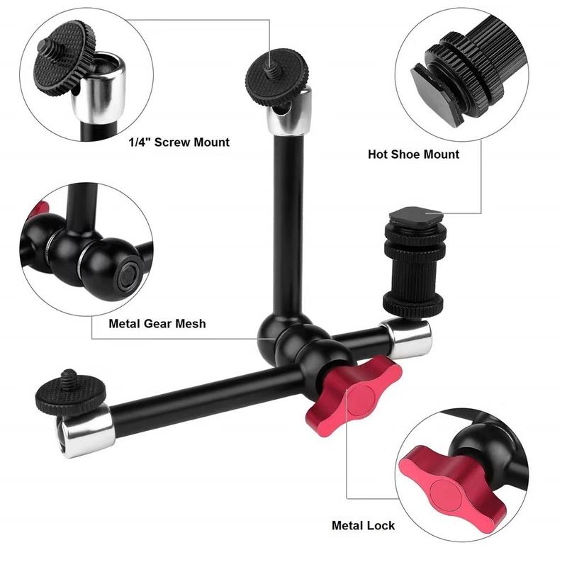 Die aus einer Aluminiumlegierung und Edelstahl gefertigte Halterung bietet eine stabile und langlebige Konstruktion mit einem Metallzahnrad-Design für eine sicherere Positionierung. Die 360°-Verstellung an allen Gelenken erleichtert die Feinjustierung der Winkel, während der Blitzschuh und die 1/4"-Befestigungshalterung eine breite Kompatibilität mit DSLR-Kameras und entsprechendem Zubehör gewährleisten. Rote Schnellverschlussgriffe ermöglichen eine schnelle Einrichtung und Neupositionierung ohne Werkzeug und helfen so, Ihren Arbeitsablauf während der Aufnahmen zu optimieren.