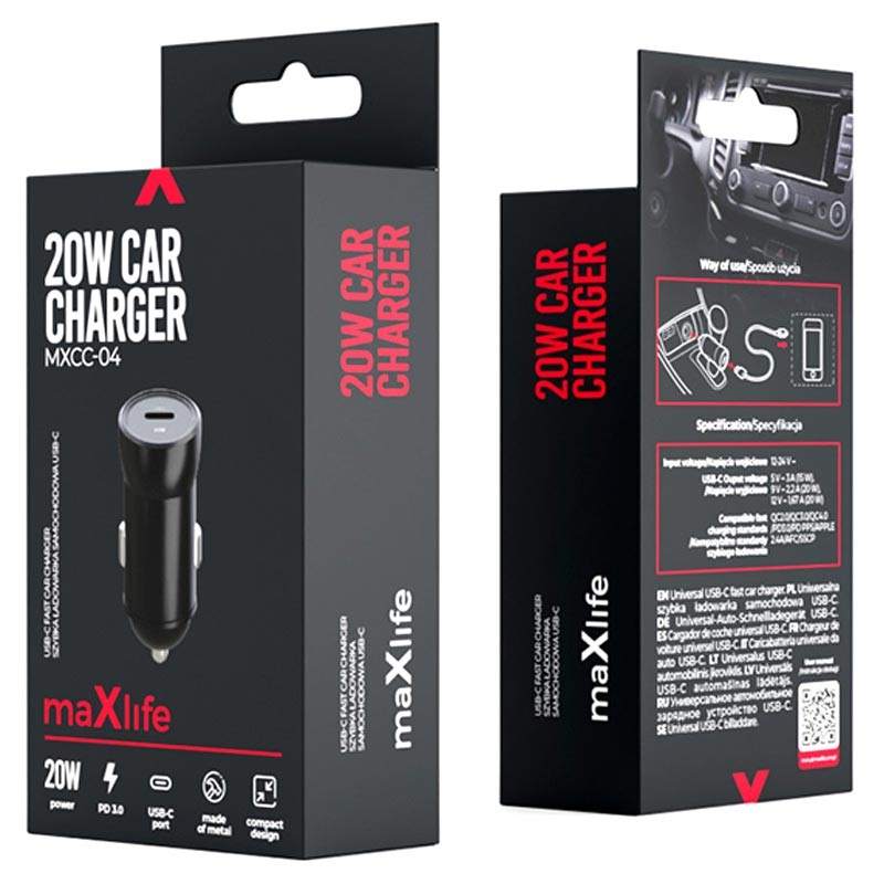 Maxlife MXCC-04 USB-C Auto-Schnellladegerät - 20W, PD3.0, QC3.0, Apple 2.4A, Samsung AFC