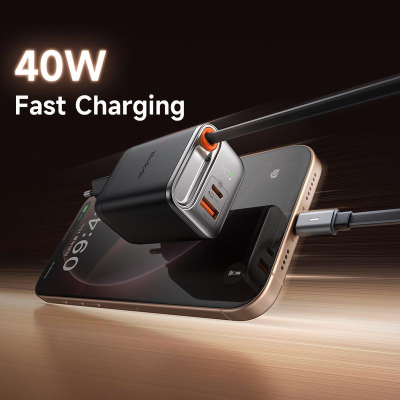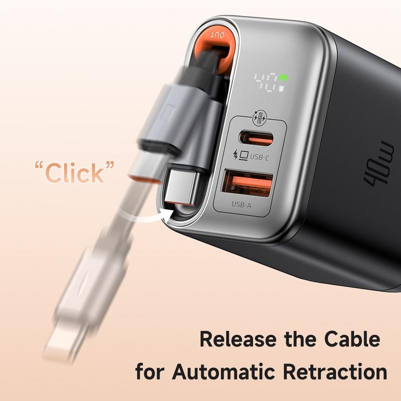 Dieses GaN-Ladegerät ist kompakt genug, um in eine Jackentasche zu passen, und dennoch leistungsstark genug, um ein MacBook Air oder Galaxy S24 aufzuladen. Es vereint drei wichtige Funktionen in einem: einen hocheffizienten 40-W-USB-C-Ausgang, einen vielseitigen USB-A-Schnellladeanschluss und ein 65cm langes Kabel, das sich mit einem Klick aufrollen lässt.