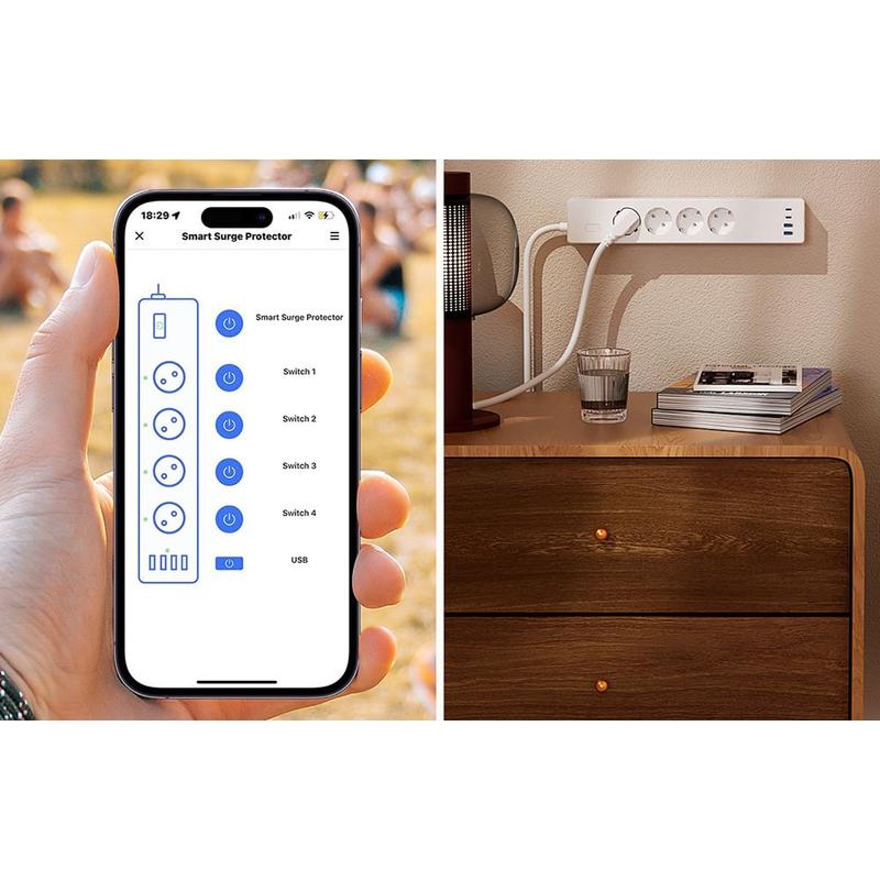 Mit der Meross App oder einem Matter-kompatiblen Ökosystem können Sie jede der vier Steckdosen unabhängig voneinander ein- oder ausschalten sowie die USB-Anschlussgruppe steuern. Verwalten Sie Ihre Geräte von überall aus - egal ob Sie zu Hause, bei der Arbeit oder auf Reisen sind.