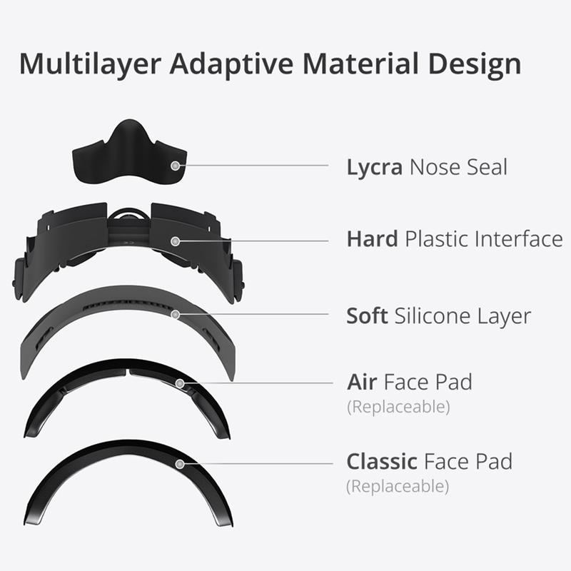 Die Maske besteht aus atmungsaktivem Lycra-Gewebe und einer lichtundurchlässigen Nasenabdichtung, die unerwünschten Lichteinfall reduziert, sodass Sie noch tiefer in Ihre VR-Welten eintauchen können. Das leichte Design sorgt dafür, dass Sie sich auf das Erlebnis konzentrieren können, nicht auf die Ausrüstung.