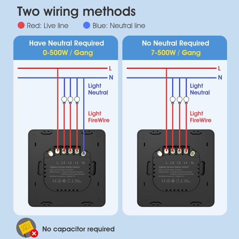 - Leistung: 7-500W/Kanal (Single-Live-Draht), 0-700W/Kanal (neutraler Draht)