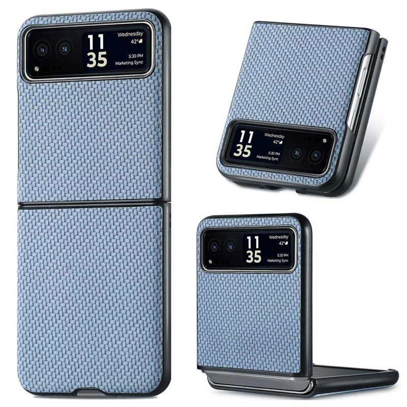 Diese schlanke, strapazierfähige Hülle besteht aus Plastik, überzogen mit feinem Polyurethan mit einer Carbonfasertextur, die die Griffigkeit und das angenehme Handgefühl verbessert. Dennoch ist die Hülle leicht und schlank, und Ihr Motorola Razr 40 bleibt so funktional wie gewohnt.