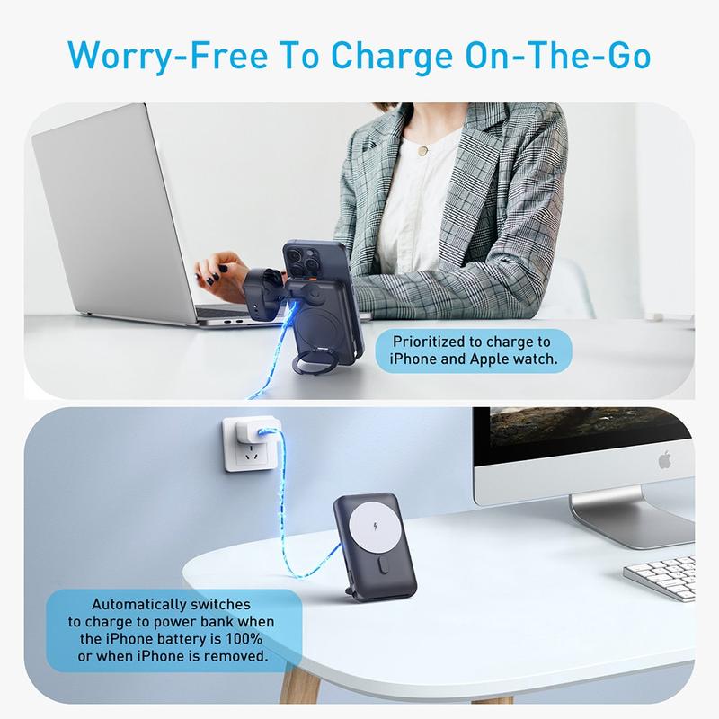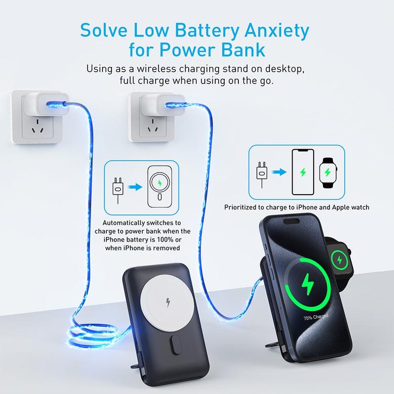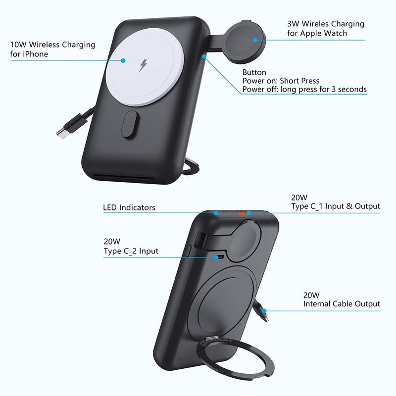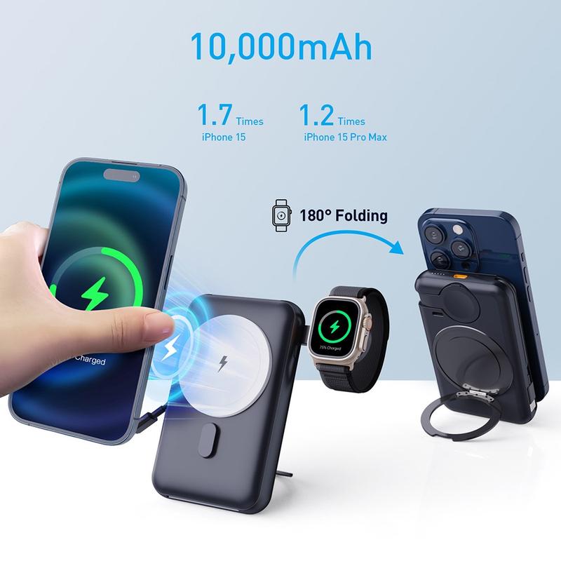 Die Powerbank MP07 mit 10000mAh ist ein intelligenter All-in-One-Ladebegleiter für Nutzer, die sich mehr Komfort, weniger Kabelsalat und mehr Flexibilität im Alltag wünschen. Durch die Kombination aus magnetischem kabellosem Laden, integriertem Kabel, Ladeunterstützung für die Apple Watch und einem klappbaren, drehbaren Ständer bietet sie eine elegante Lösung, um Ihre wichtigsten Geräte den ganzen Tag über mit Strom zu versorgen. Egal, ob Sie pendeln, auf Reisen sind, arbeiten oder sich einfach nur von Raum zu Raum bewegen - dieses kompakte Ladegerät sorgt für mehr Ordnung und Praktikabilität.