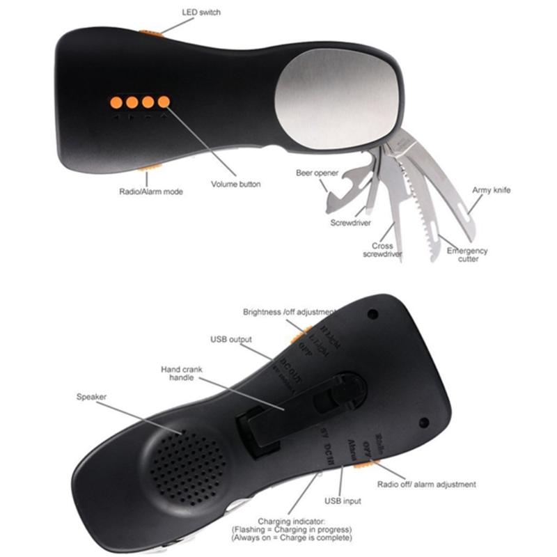 Multifunktionale Handkurbel-Taschenlampe mit FM-Radio, 5-teiliges Notfallwerkzeug-Set
