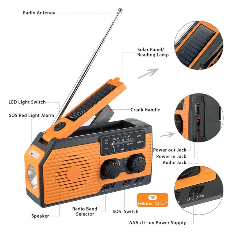 - Die Handkurbel lädt das Radio auf, wenn es keine anderen Möglichkeiten mehr gibt