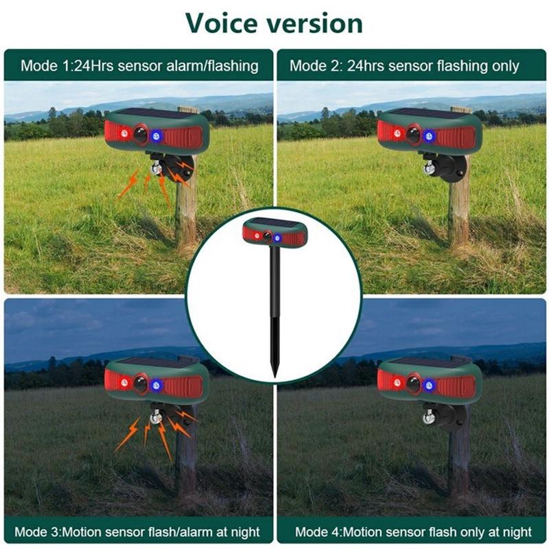 Dieses Gerät verfügt über 12 rotierende Soundeffekte, darunter Sirenen, Hundegebell und schussähnliche Geräusche, und bietet damit eine vielseitige Abschreckungslösung, um Tiere und Schädlinge von Ihrem Grundstück fernzuhalten.