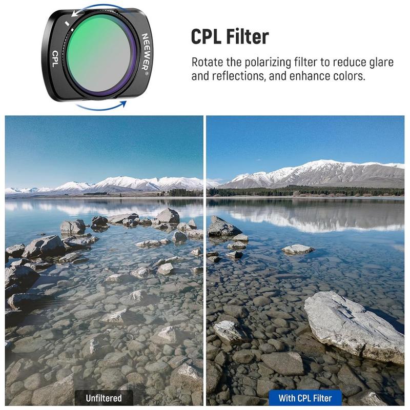 - CPL-Filter - Zirkularpolarisationsfilter sind einzigartig in ihrer Fähigkeit, Reflexionen von nichtmetallischen Oberflächen zu reduzieren und so den Farbkontrast und die Klarheit des Bildes zu verbessern, was besonders bei Landschaftsaufnahmen von Vorteil ist.