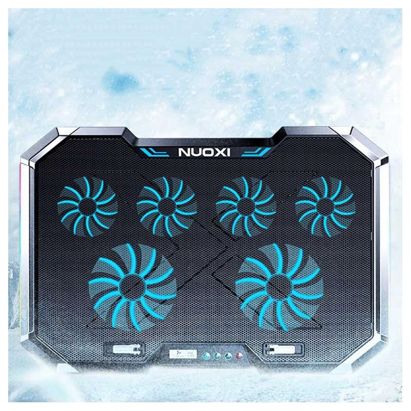 Das Nuoxi Q8 KühlPad ist eine hilfreiche und ideale Lösung für den Umgang mit einem Laptop, der unangenehm warm wird. Ausgestattet mit zwei großen und vier kleinen Lüftern, sorgt es für ausreichend Belüftung und kühlenden Luftstrom für Ihr Gerät. Mit den RGB-Beleuchtungseffekten, die rund um die Basis des Pads verlaufen, können Sie Ihren Laptop auch cool aussehen lassen. Es sind Steuertasten und ein Display auf der Vorderseite vorhanden, mit denen Sie die Lüftergeschwindigkeit und den Lichteffekt einfach einstellen können, während die praktischen Clips dafür sorgen, dass Ihr Laptop fest und sicher an seinem Platz bleibt.