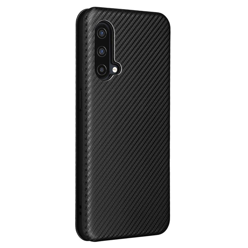 Bewahren Sie Ihr OnePlus Nord CE 5G in diesem Flip-Case mit Kohlefaser-Textur auf Nummer sicher auf.