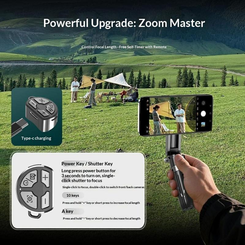 Die mitgelieferte Bluetooth 5.2-Fernbedienung ermöglicht das Auslösen von Fotos und Videos aus bis zu 10 m Entfernung. Sie unterstützt das Umschalten zwischen vorderer und hinterer Kamera sowie das Zoomen und Fokussieren und gibt Ihnen die volle Kontrolle, ohne dass Sie Ihr Telefon berühren müssen.