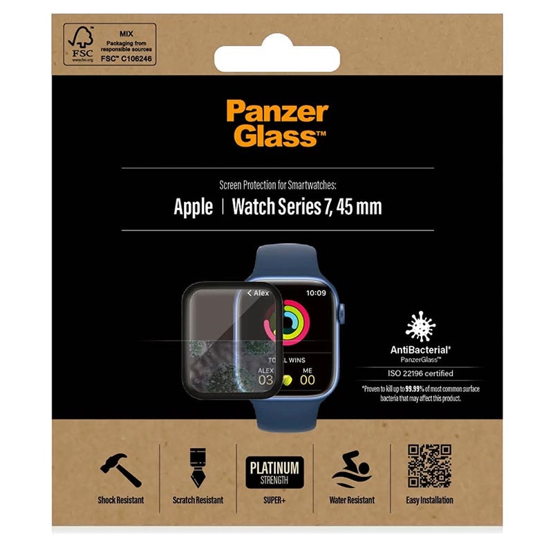 • PanzerGlass AntiBacterial Displayschutzfolie aus gehärtetem Glas für Apple Watch Series 9, Apple Watch Series 8, Apple Watch Series 7
