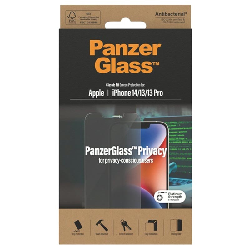 PanzerGlass Classic Fit Privacy AntiBacterial Panzerglas für iPhone 13, iPhone 13 Pro, iPhone 14