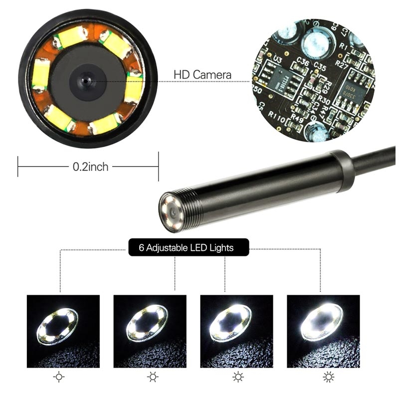 Diese Endoskopkamera verfügt über einen Micro-USB-Anschluss und einen USB-Adapter, sodass Sie sie an Ihr Micro-USB-Smartphone/Tablet oder Ihren PC/Laptop anschließen können. Dank der IP67-Wasserdichtigkeitszertifizierung können Sie es sogar in nassen Umgebungen oder unter Wasser verwenden. Die wasserdichte Endoskopkamera ist mit sechs LEDs ausgestattet, die die Helligkeit erhöhen und für klare Sicht sorgen.