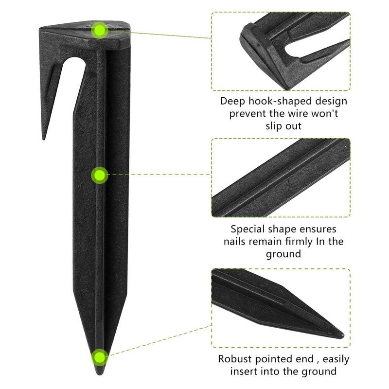 - Vielseitigkeit: Ideal zum Befestigen von Begrenzungskabeln, Sichern von Gartengeweben, Verankern von Schläuchen und mehr.
