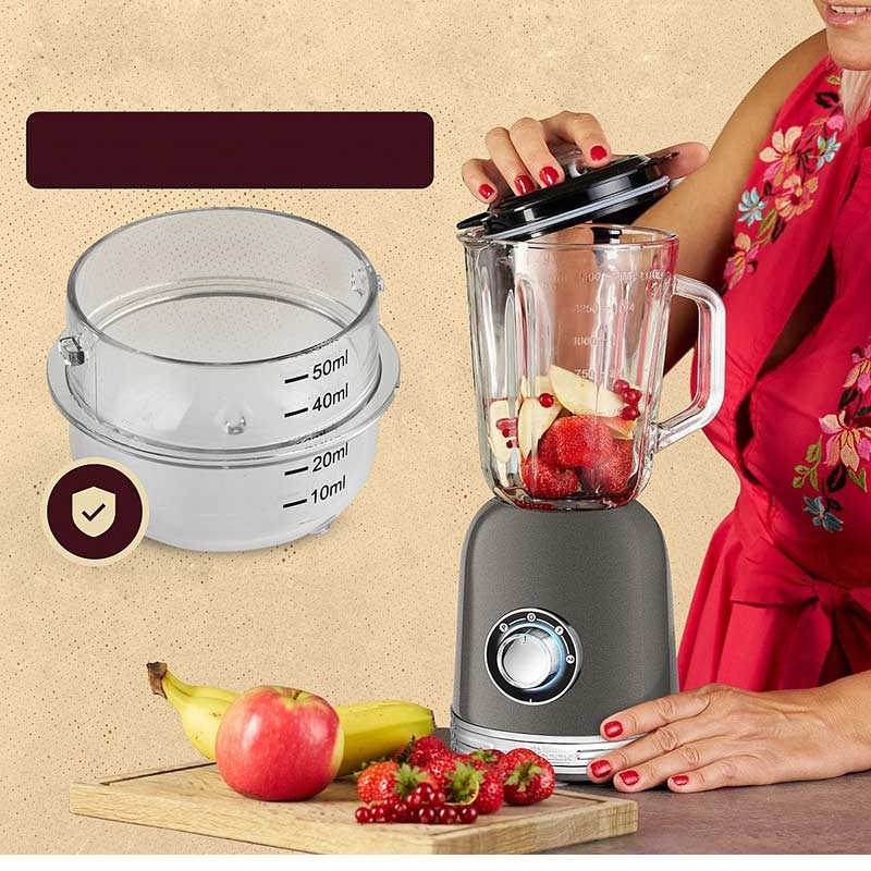- 1,5-Liter-Glasbehälter: Langlebig und leicht zu reinigen, mit einer Messskala.