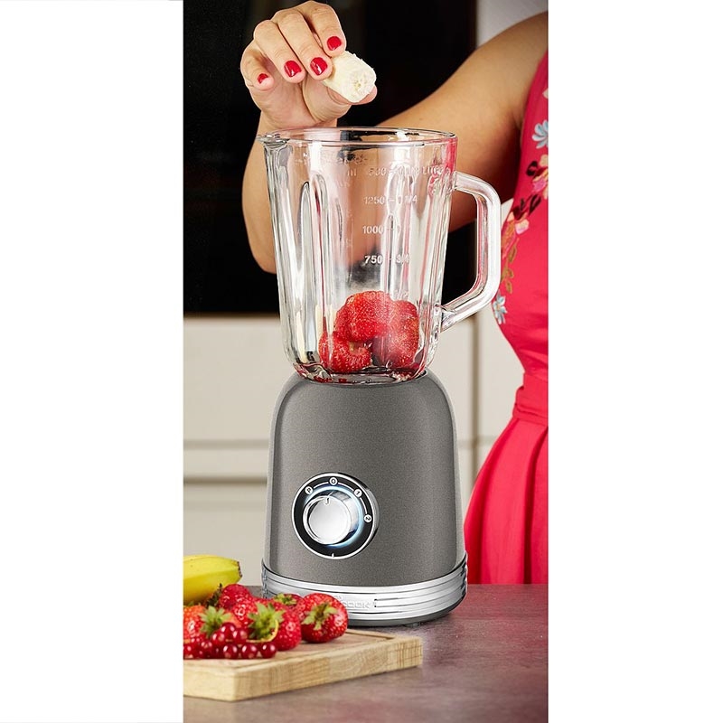 Der ProfiCook PC-UM 1195 Blender kombiniert einen stilvollen Vintage-Look mit robuster Funktionalität. Mit einem 800-Watt-Motor und einem 1,5-Liter-Glasbehälter eignet er sich hervorragend zum Pürieren, Hacken, Mixen und sogar zum Crushen von Eis. Der Mixer verfügt über 4 Geschwindigkeitsstufen, darunter eine Puls-/Turbo-Funktion, und eine rostfreie 4-fach-Edelstahlklinge mit "Piranha"-Schliff für effizientes Mixen. Das solide Metallgehäuse und der beleuchtete Drehschalter sorgen für Langlebigkeit und Eleganz, während die Saugfüße für Stabilität während des Gebrauchs sorgen.