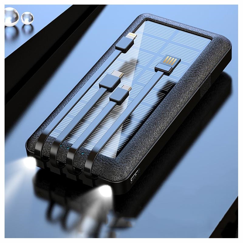 Mit den integrierten Kabeln für Lightning, USB-C, USB-A und MicroUSB können Sie fast jedes moderne, wiederaufladbare Gerät aufladen, selbst wenn Sie das Kabel zu Hause vergessen haben. Darüber hinaus gibt es zwei weitere Eingangsanschlüsse zum Aufladen der Powerbank über MicroUSB oder USB-C und einen USB-A High-Speed-Ausgangsanschluss. Das monokristalline Silizium-Solarpanel bietet mehr Einstellungsmöglichkeiten für eine solide Außenbeleuchtung. Bringen Sie Licht in die dunklen Stunden dank der zwei eingebauten LED-Leuchten in dieser Psooo PS-159 Solar-Powerbank.