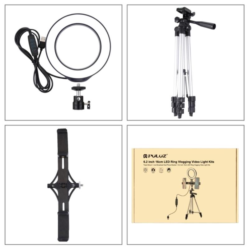 PULUZ Stativhalterung + Live Broadcast Dual Phone Bracket + 6.2" 16cm LED Ring Vlogging Video Light Kits