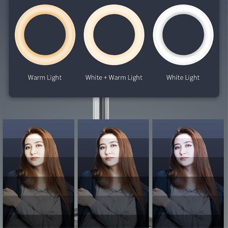 Es gibt 3-Farben-Licht-Modus-Optionen, Unterstützung 9-Gang einstellbar, 8-Zoll-Ringlicht bietet weiche und charmante Beleuchtung, die hilft, glätten Schatten und verstecken Hautunreinheiten, perfekt für Videokonferenzen, Zoom-Anrufe, Live-Streaming, Self-Broadcasting, Online-Unterricht und Make-up-Sitzung