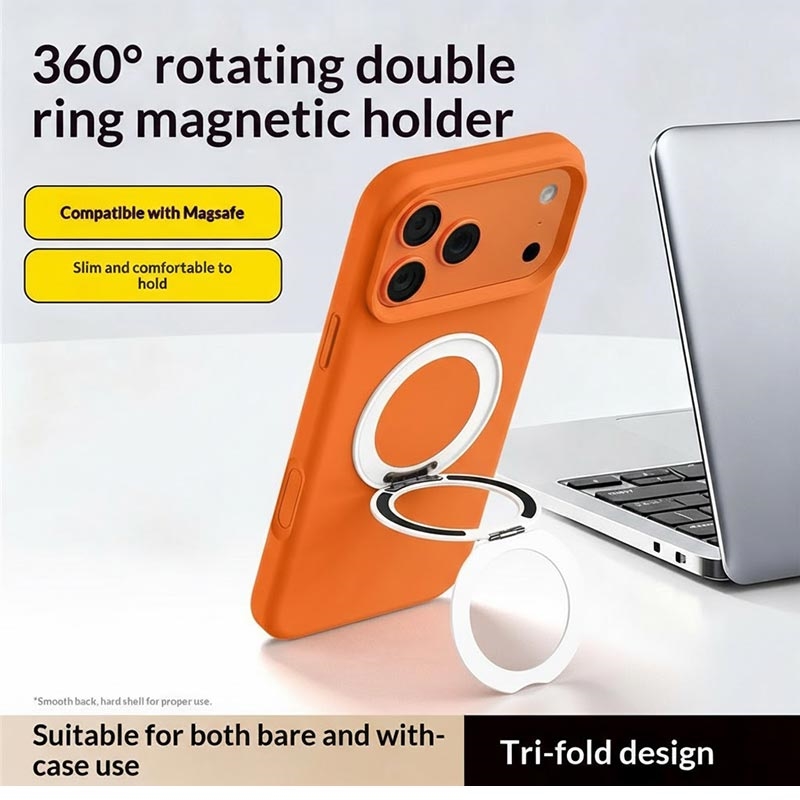 Der ultradünne, dreifach faltbare magnetische Ringständer des Q11 ist ein eleganter Telefongriff und -ständer, der für den flexiblen Einsatz im Alltag entwickelt wurde, ohne dabei aufzutragen. Mit seiner dreifach faltbaren Struktur lässt er sich kompakt zusammenklappen, wenn er nicht gebraucht wird, während die 360°-Drehung eine schnelle Anpassung zwischen Hoch- und Querformat ermöglicht. Die selbstklebende Rückseite ermöglicht eine schnelle und sichere Installation, und der integrierte Magnet sorgt für Kompatibilität mit magnetischen Halterungen und Zubehör.