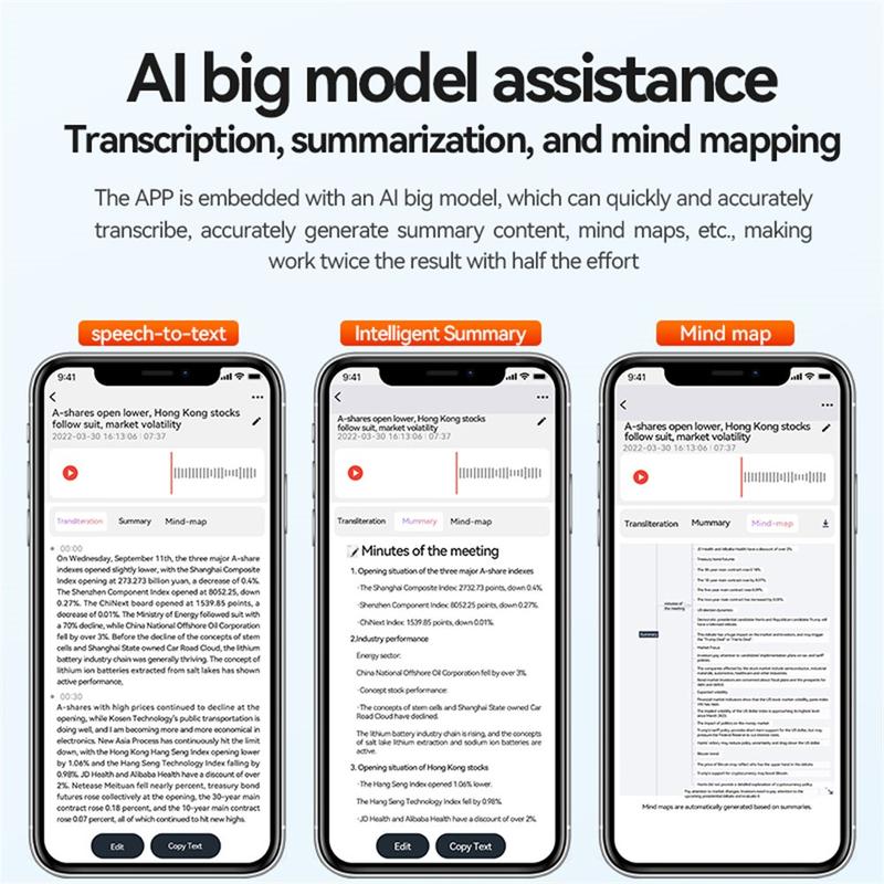 - KI-gestützte Transkription: Verbinden Sie sich über Bluetooth mit der AIREC-APP, um Sprache in 188 Sprachen zu transkribieren und zu übersetzen, unterstützt von ChatGPT.