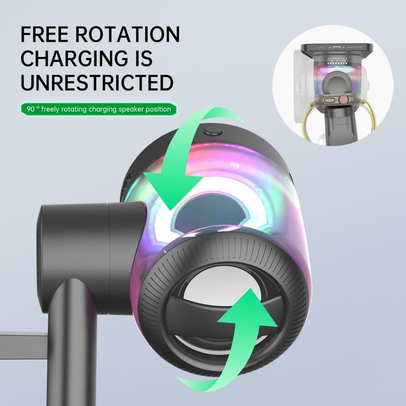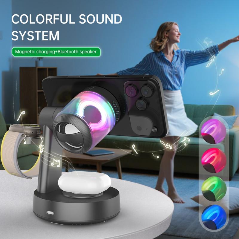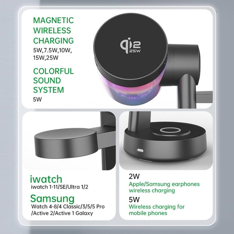 QI2.2 25W Magnetische kabellose Ladestation mit Bluetooth-Lautsprecher und RGB-Umgebungsbeleuchtung - 3-in-1-Ladegerät für Telefon, Kopfhörer und Smartwatch