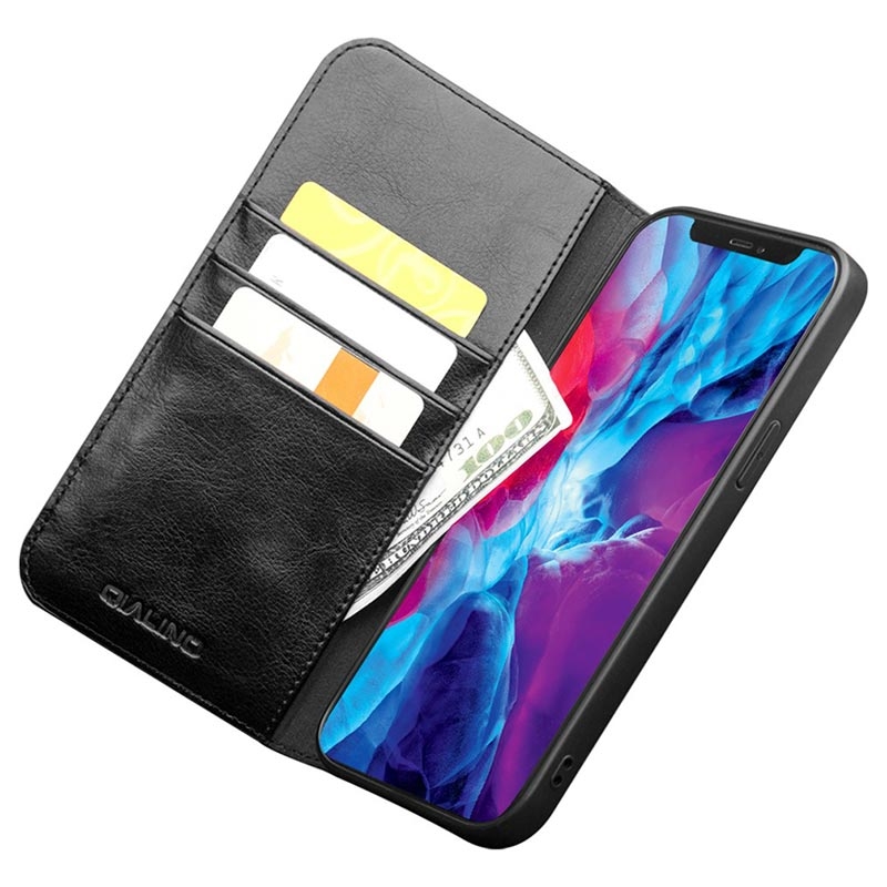 Qialino Classic iPhone 13 Pro Lederhülle mit Geldbörse - Schwarz