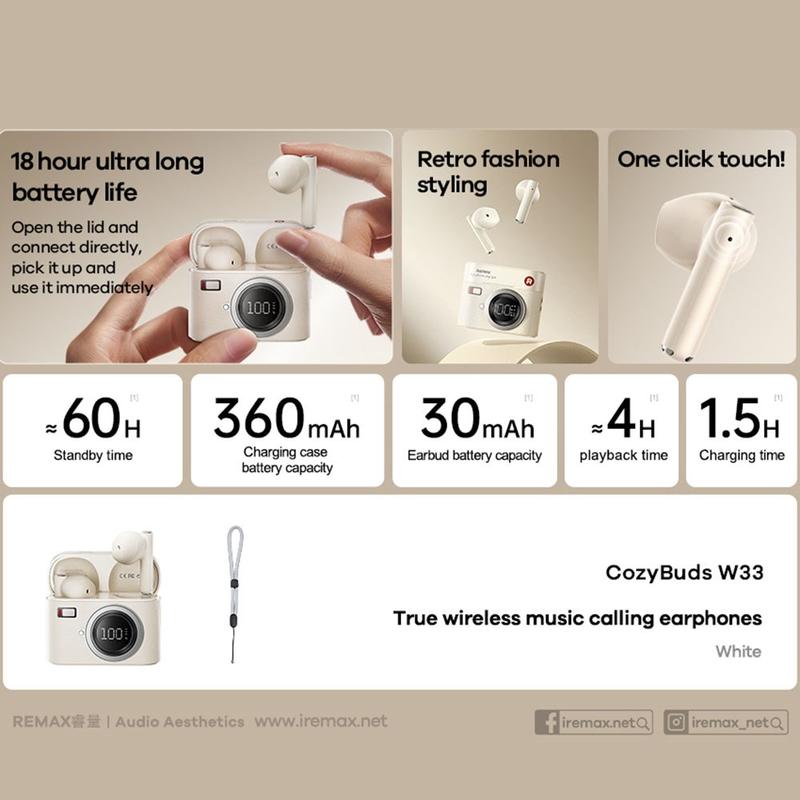 • Remax CozyBuds W33 True Wireless Earphones mit Bluetooth 5.4 - Ladeetui mit LED-Bildschirm, 4 Stunden Spielzeit