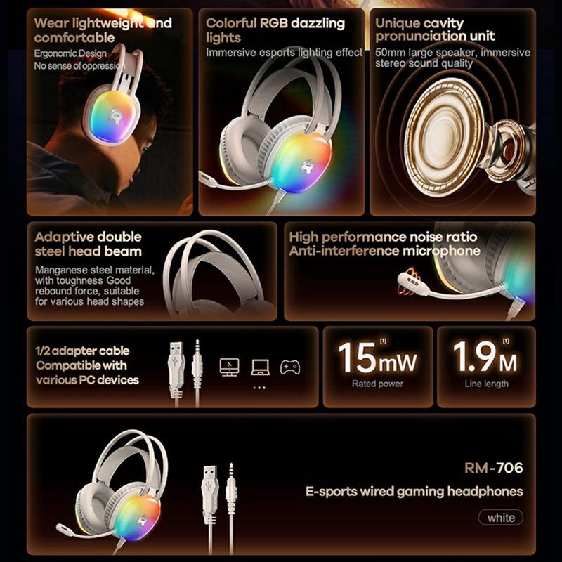 Remax RM-706 Kabelgebundenes Over-Ear-Gaming-Headset mit Mikrofon und RGB-Beleuchtung - Weiß