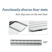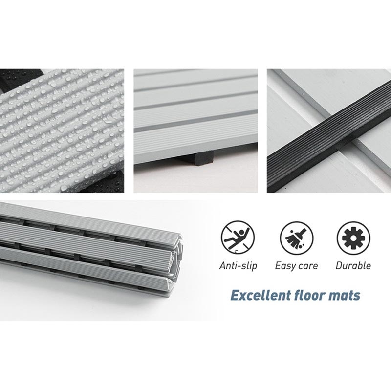 Die Matte ist mit großen, strategisch platzierten Drainageschlitzen ausgestattet, durch die das Wasser schnell abfließen kann, wodurch Staunässe vermieden wird und der Boden schneller trocknet. Dadurch wird auch das Risiko von Schimmelbildung und verstopften Bereichen verringert.