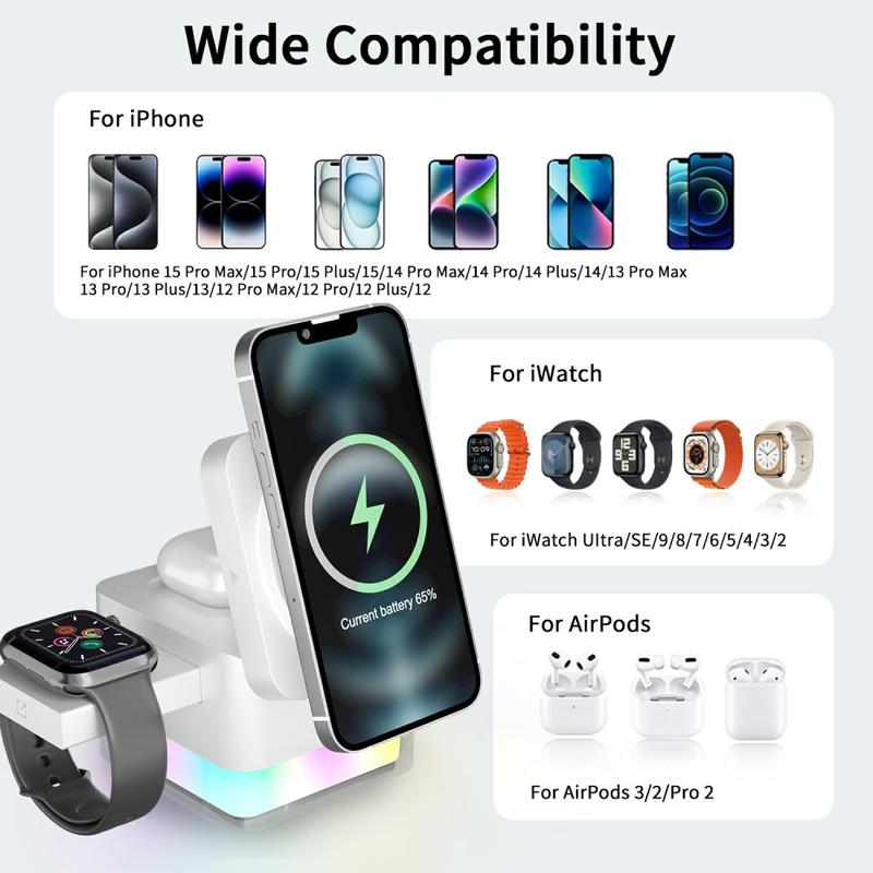 Die magnetische Ausrichtung sorgt dafür, dass kompatible Geräte für einen stabilen Ladevorgang in der richtigen Position bleiben, während das faltbare Design es ermöglicht, die Ladestation einfach in eine Tasche oder einen Rucksack zu verstauen. Außerdem verfügt sie über eine RGB-Umgebungsbeleuchtung, die für einen sanften, dekorativen Lichtschein sorgt und als sanftes Nachtlicht auf dem Schreibtisch oder Nachttisch dienen kann.