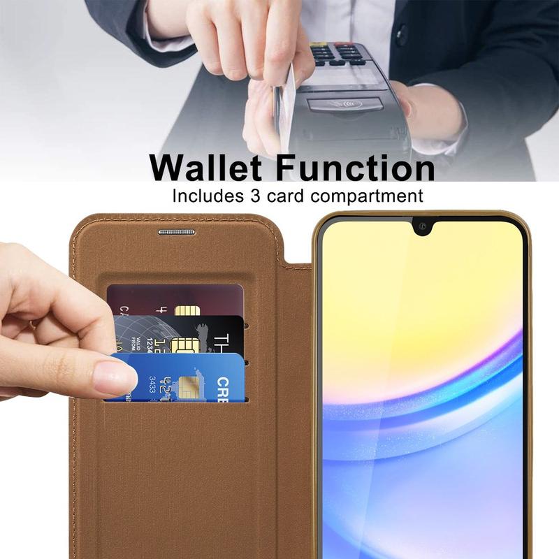 Diese Premium-Hülle für das Samsung Galaxy A15 ist aus hochwertigem TPU, Acryl und Polyurethan gefertigt und wird in einem feinen Verfahren hergestellt, um eine zarte und exquisite Oberfläche zu gewährleisten. Es ist mit einem praktischen Kartenschlitz für einfaches Durchziehen und Ausgeben unterwegs ausgestattet und verfügt über einen starken Magneten für automatisches Schließen, wodurch es sicher und bequem ist, Gegenstände im Inneren zu verwalten. Diese Samsung Galaxy A15-Hülle bietet effektiven Schutz vor täglicher Abnutzung, Kratzern, Schrammen und Schrammen, während die fortschrittliche RFID-Blockierungstechnologie im Kartenschlitz dafür sorgt, dass Ihre persönlichen Daten vor Diebstahl geschützt sind. Darüber hinaus ist der integrierte Magnetring mit dem kabellosen MagSafe-Ladeverfahren kompatibel, so dass Sie Ihr Samsung Galaxy A15 aufladen können, ohne die Tasche abnehmen zu müssen.