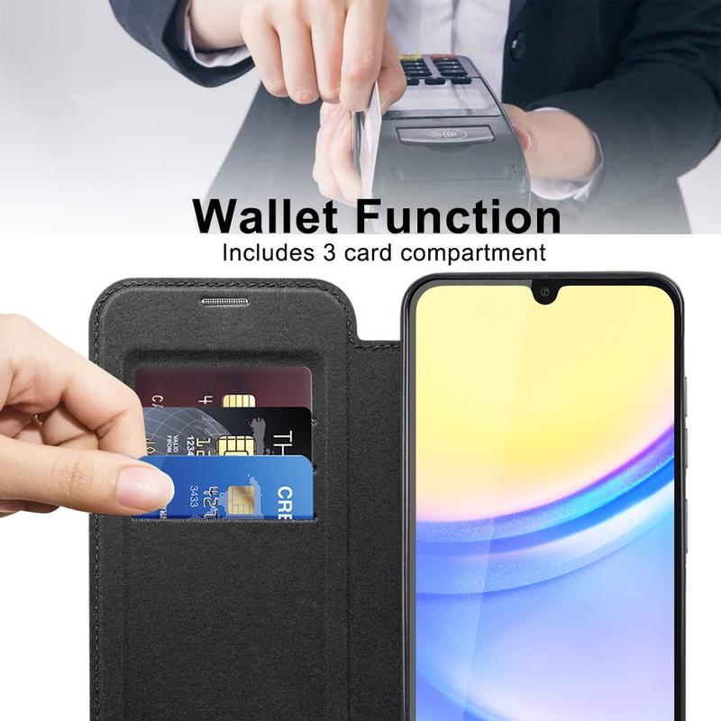 Diese Premium-Hülle für das Samsung Galaxy A15 ist aus hochwertigem TPU, Acryl und Polyurethan gefertigt und wird in einem feinen Verfahren hergestellt, um eine zarte und exquisite Oberfläche zu gewährleisten. Es ist mit einem praktischen Kartenschlitz für einfaches Durchziehen und Ausgeben unterwegs ausgestattet und verfügt über einen starken Magneten für automatisches Schließen, wodurch es sicher und bequem ist, Gegenstände im Inneren zu verwalten. Diese Samsung Galaxy A15-Hülle bietet effektiven Schutz vor täglicher Abnutzung, Kratzern, Schrammen und Schrammen, während die fortschrittliche RFID-Blockierungstechnologie im Kartenschlitz dafür sorgt, dass Ihre persönlichen Daten vor Diebstahl geschützt sind. Darüber hinaus ist der integrierte Magnetring mit dem kabellosen MagSafe-Ladeverfahren kompatibel, so dass Sie Ihr Samsung Galaxy A15 aufladen können, ohne die Tasche abnehmen zu müssen.