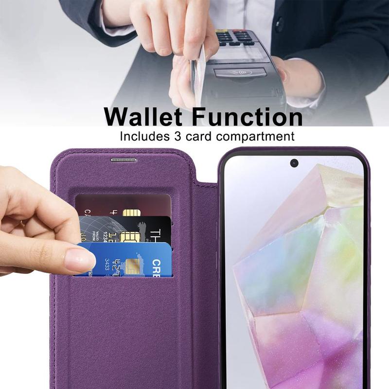 Diese Premium-Hülle für das Samsung Galaxy A35 ist aus hochwertigem TPU, Acryl und Polyurethan gefertigt und wird in einem feinen Verfahren hergestellt, um eine zarte und exquisite Oberfläche zu gewährleisten. Es ist mit einem praktischen Kartenschlitz für einfaches Durchziehen und Ausgeben unterwegs ausgestattet und verfügt über einen starken Magneten für automatisches Schließen, wodurch es sicher und bequem ist, Gegenstände im Inneren zu verwalten. Diese Samsung Galaxy A35-Hülle bietet effektiven Schutz vor täglicher Abnutzung, Kratzern, Schrammen und Schrammen, während die fortschrittliche RFID-Blockierungstechnologie im Kartenschlitz dafür sorgt, dass Ihre persönlichen Daten vor Diebstahl geschützt sind. Darüber hinaus ist der integrierte Magnetring mit dem kabellosen MagSafe-Ladeverfahren kompatibel, so dass Sie Ihr Samsung Galaxy A35 aufladen können, ohne die Tasche abnehmen zu müssen.