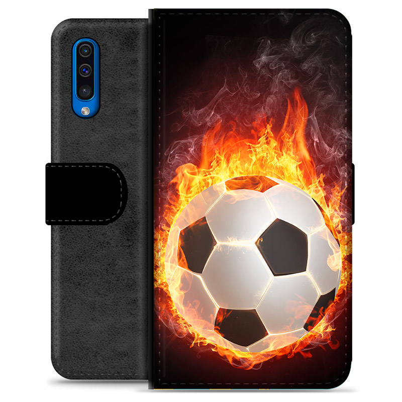 Samsung Galaxy A50 Premium Schutzhülle mit Geldbörse - Fußball Flamme