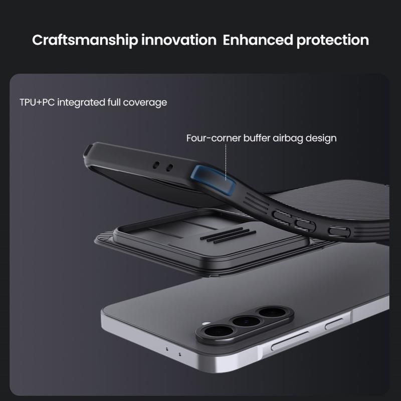 Genießen Sie zusätzliche Privatsphäre und Schutz mit der CamShield Pro-Hybridhülle von Nillkin. Durch die Kombination von starrem Kunststoff und TPU verhindert die Kameraabdeckung Kratzer und schützt gleichzeitig Ihr Samsung Galaxy A56 vor täglicher Abnutzung.