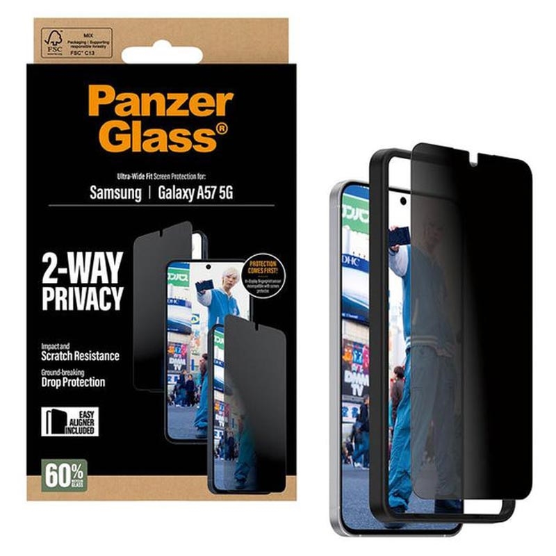 - Der PanzerGlass Ultra-Wide Fit Privacy EasyAligner Displayschutz ist NICHT mit dem Fingerabdrucksensor des Samsung Galaxy A57 kompatibel