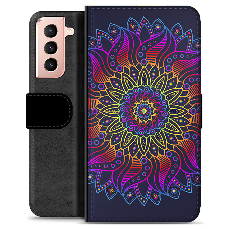 Die Samsung Galaxy S21 5G Premium Schutzhülle mit Geldbörse kombiniert stilvollen Schutz mit praktischer Funktionalität. Diese hochwertige, langlebige Hülle zeichnet sich durch ein auffälliges buntes Mandala-Design auf der Vorderseite aus, das Ihrem Smartphone eine persönliche Note verleiht und zugleich als modisches Accessoire dient.