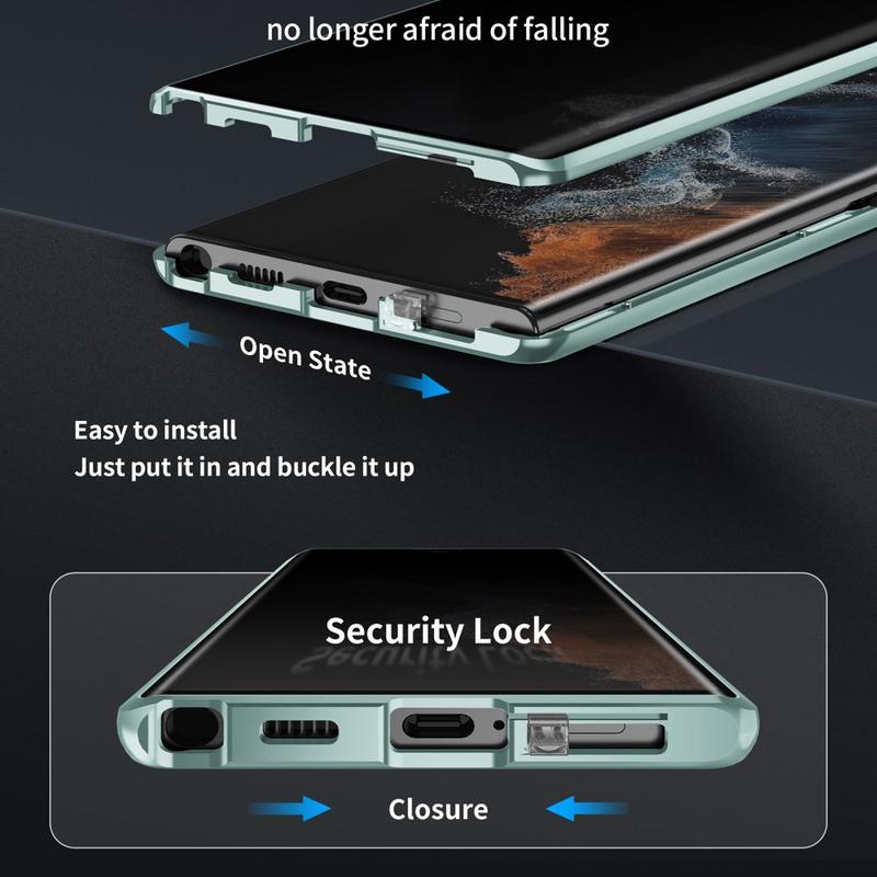 Das zweiteilige Design bietet einfache Befestigung und sicheren Verschluss dank Magneten und Schnalle. Eingebautes gehärtetes Glas auf der Vorderseite schützt das Display vor Kratzern und Stößen, der seitliche Metallrahmen vor Stößen und Stürzen, während mattes Verbundmaterial die Rückseite des Samsung Galaxy S23 Ultra 5G abschirmt.