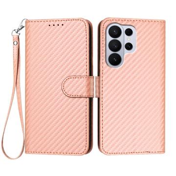 Samsung Galaxy S26 Ultra Premium Wallet Hülle mit Riemen - Kohlefaserstruktur - Carbon Pink