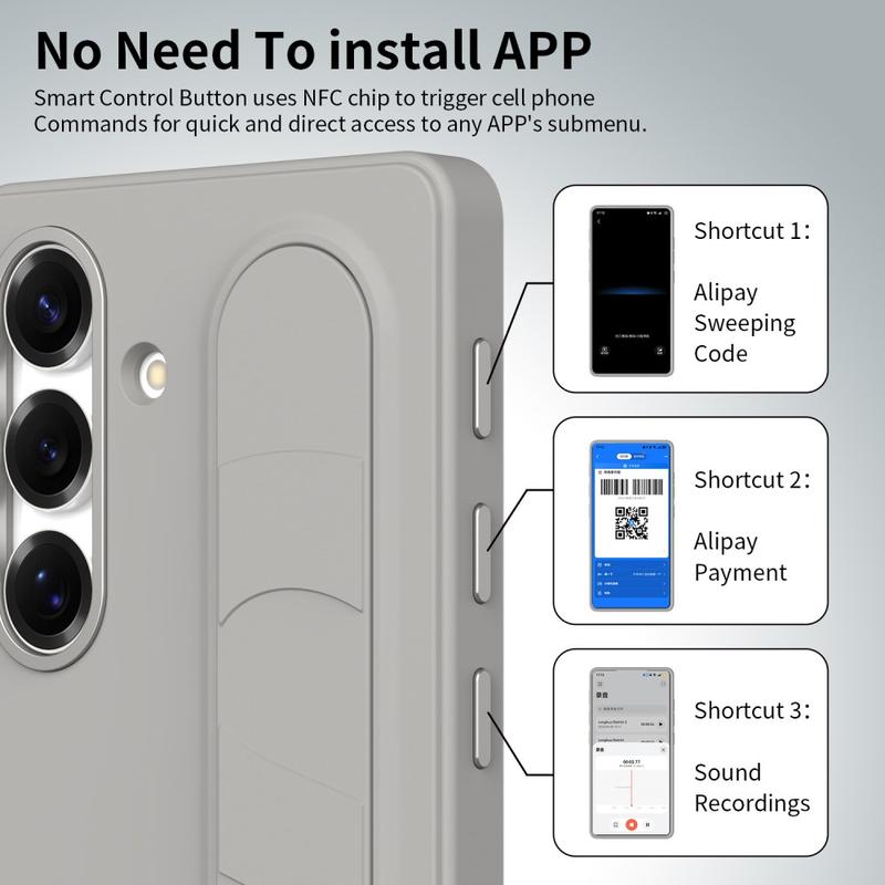 Ausgestattet mit drei intelligenten NFC-fähigen Tasten ermöglicht diese intelligente Hybrid-Hülle den schnellen Zugriff auf Apps wie Kamera, Blitzlicht oder Screenshot mit einem einzigen Druck. Kein Aufladen, keine zusätzlichen Apps - nur einfache, sofortige Funktionalität.