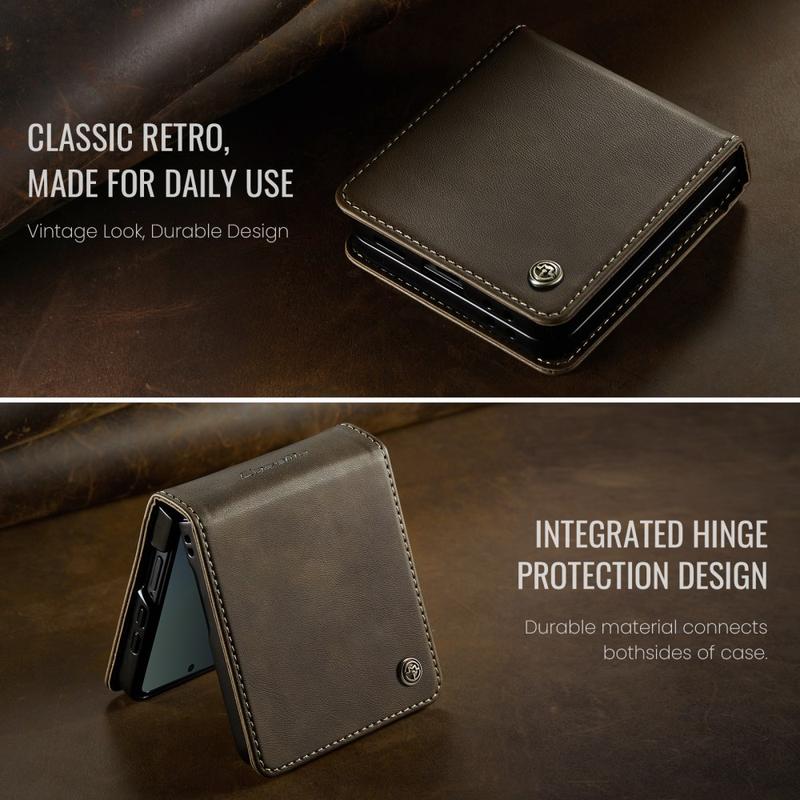 Das Wallet Case der CASEME 033 Serie für das Samsung Galaxy Z Flip7 besteht aus Polyurethan mit Kalbslederstruktur und TPU. Es bietet umfassenden Schutz vor Kratzern, Stößen und alltäglicher Abnutzung und besticht gleichzeitig durch sein hochwertiges, elegantes Design.