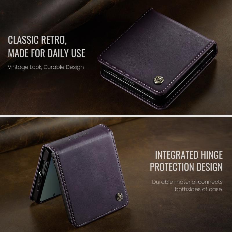 Das Wallet Case der CASEME 033 Serie für das Samsung Galaxy Z Flip7 besteht aus Polyurethan mit Kalbslederstruktur und TPU. Es bietet umfassenden Schutz vor Kratzern, Stößen und alltäglicher Abnutzung und besticht gleichzeitig durch sein hochwertiges, elegantes Design.
