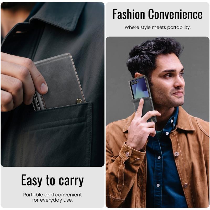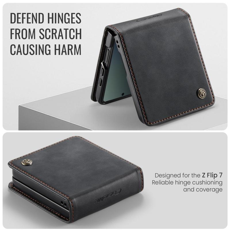 Das Wallet Case der CASEME 033 Serie für das Samsung Galaxy Z Flip7 besteht aus Polyurethan mit Kalbslederstruktur und TPU. Es bietet umfassenden Schutz vor Kratzern, Stößen und alltäglicher Abnutzung und besticht gleichzeitig durch sein hochwertiges, elegantes Design.