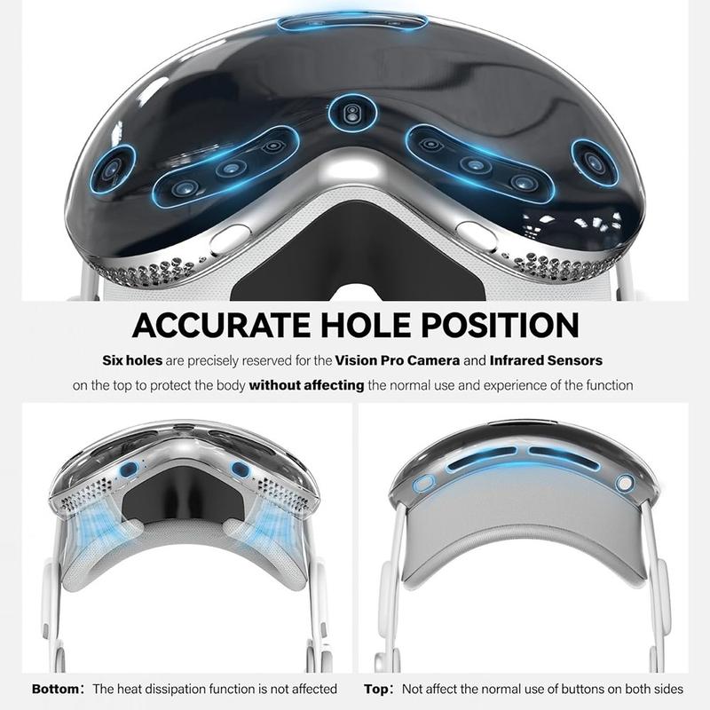 Präzise Lochpositionen: Die transparente Hülle verfügt über 6 präzise Lochpositionen für die Kamera und den Infrarotsensor des Vision Pro, die den normalen Gebrauch beim Tragen nicht beeinträchtigen werden. Gleichzeitig sind präzise Lochpositionen für die Einlass- und Auslassstrahler und die Knöpfe reserviert, die die Wärmeableitungsfunktion und die normale Nutzung der Knöpfe beim Tragen nicht beeinträchtigen. Genießen Sie den visuellen Genuss der VR und schützen Sie gleichzeitig die VR