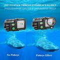 - Ein Objektivanschlussdurchmesser von 67 mm hat sich in der Branche als Standard etabliert, da er zu vielen gängigen Tauchfiltern und Weitwinkelobjektiven passt.